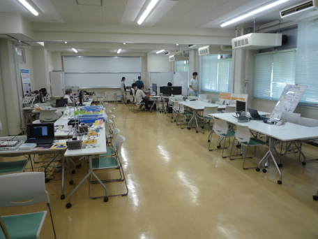 さてこれらの会場がその後どうなったかというと......ちょうどお昼頃でしょうか、以下のようになりました。以下の写真は朝に学生が集合した教室ですが、座学用に並んでいた机が一掃されて、各展示用に並び替えられるとともに展示物の調整が進んでいました。